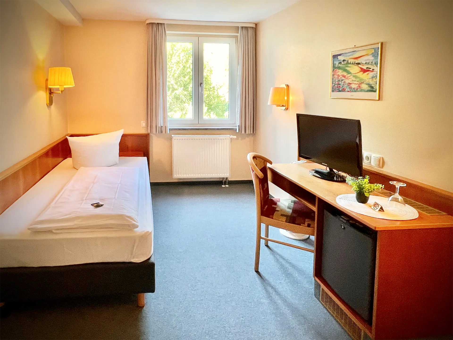 Die Ausstattung unserer Zimmer verspricht einen angenehmen Aufenthalt. Die ruhige Lage unseres Hotels einen erholsamen Schlaf. Alle Zimmer verfügen über Bad oder Dusche/WC, Föhn, Flat-TV, Minibar, Safe, sowie kostenfreies WLAN.